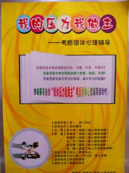 本次团体辅导活动,让同学们在紧张而快节奏的高中生活中,在面对巨大压力以及失败的过程中,重拾信心,学会如何应对压力失败,同时给同学们学习生活注入了新活力,丰富了学生高中生活内容,让同学们能够发现和体会生活中的快乐,珍惜生活,把握精彩人生成长为一名充满正能量的高中生。