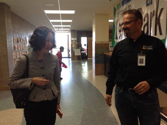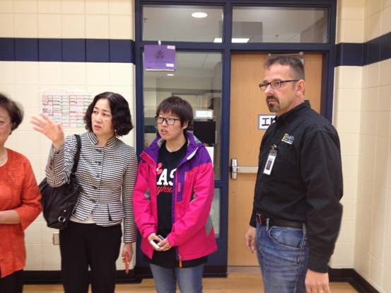 李岩校长首先参观了小学课堂。美国教师热情欢迎两位客人参观,并为他们介绍了教学内容、教学方式等。李岩校长对教室中独特的设计十分感兴趣,并进行询问。结束了课堂参观后,李校长来到了学生图书馆、学生食堂和操场,在此过程中与德鲁斯市教育局局长交流中美基础教育的不同之处,分享中美教育特色。