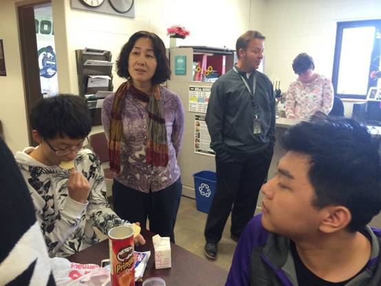 随后,李岩校长一行对正在该校学习的我校国际部学生进行慰问。同学们激动地 与校长、老师相拥。同学们一边吃着校长带来的零食,一边向校长老师汇报再寄宿家庭的生活情况及在校的学习情况。李岩校长亲切地嘱咐同学们要勇于表达自己的诉求,锻炼自己解决问题的能力,积极地融入美国家庭与学校课堂中,认真学习感受美国文化。