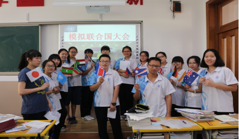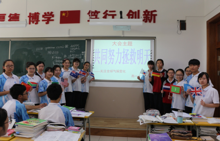 2016年6月17日下午,模拟联合国大会在高一七、高一八班举行,与会的代表国包括马尔代夫、马绍尔群岛共和国、日本、苏丹、朝鲜、南非、中国、印度、俄罗斯、韩国、英国、德意志联邦共和国、澳大利亚等14个国家。本次大会旨在通过商讨,共同明确面对日益严重恶化的气候问题,各国应尽的责任及义务,进而为地球气候环境的改善制定方针和策略。