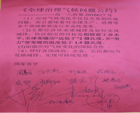 本次活动,同学们认识到,发展问题是全人类的问题,地球是全人类的地球,唯有放下偏见,放下对立,朝着共同的目标奉献自己的全力,才能促进世界的气候改善,才能促进世界的和平和发展。(高一七班 姜君供稿)